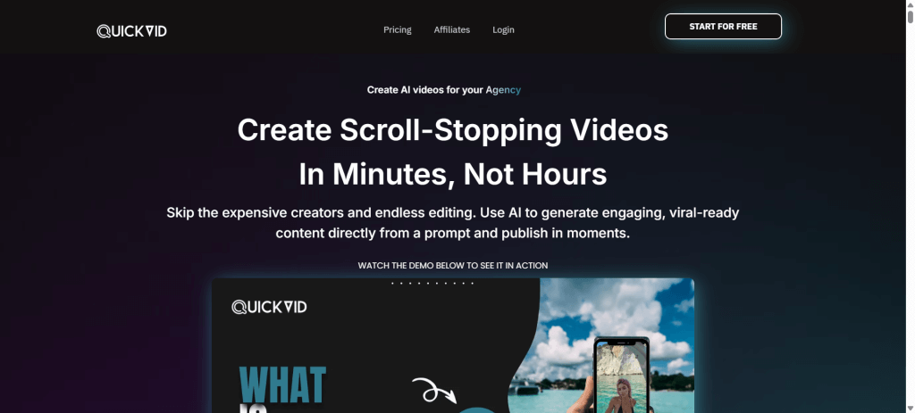 QuickVid is an AI-powered video creation platform focused on creating short-form social videos (TikTok, Instagram Reels, YouTube Shorts) in a fraction of the time it would normally take.