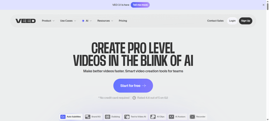 VEED.io is an online video editing and creation platform that includes AI video generation tools. Unlike other tools on this list, AI video creation is more of an add-on. The core functionality of Veed is its online video editing tools.