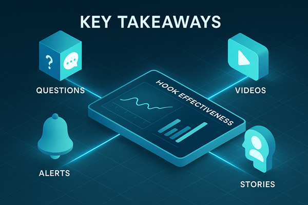 - Proven formulas increase success: curiosity gaps, specific numbers, pain point addressing, FOMO triggers, and identity-based targeting all boost hook performance